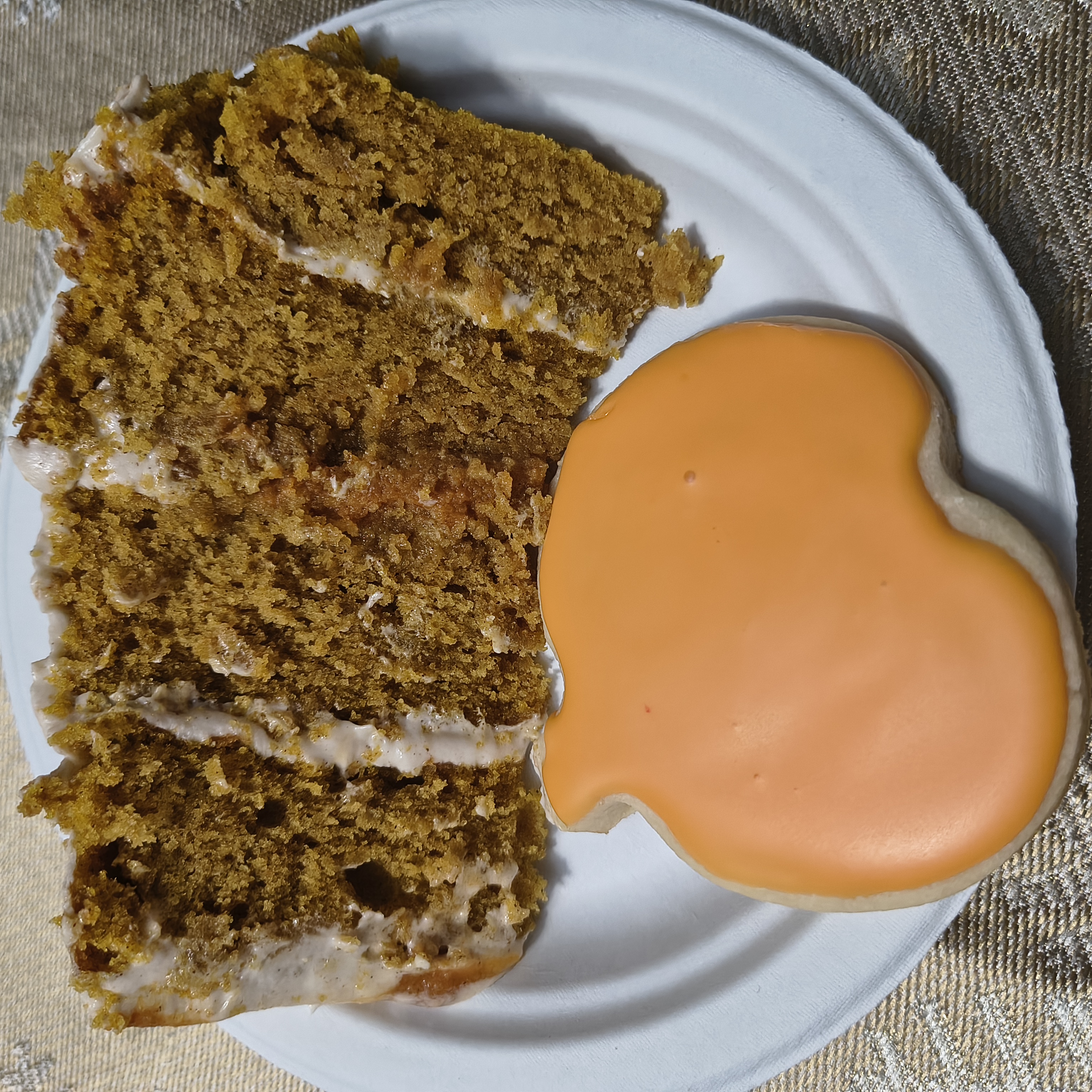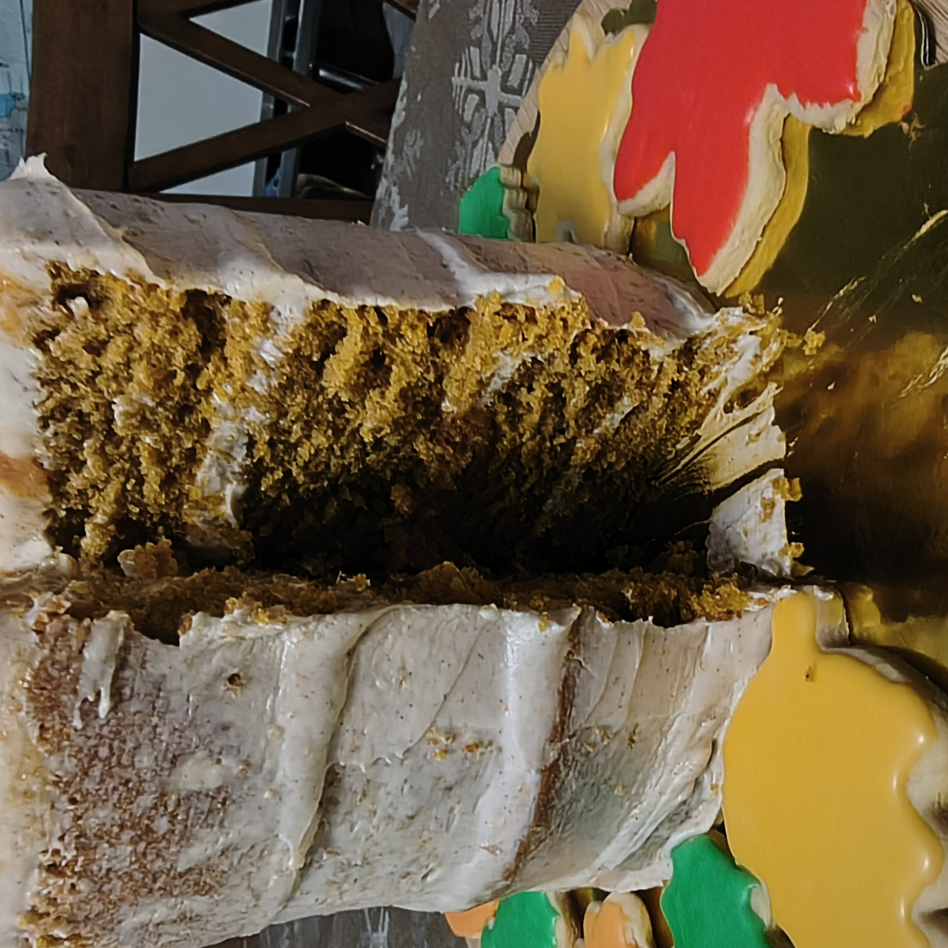 Pumpkin flavored cake layered with cream cheese frosting and pumpkin curd filling